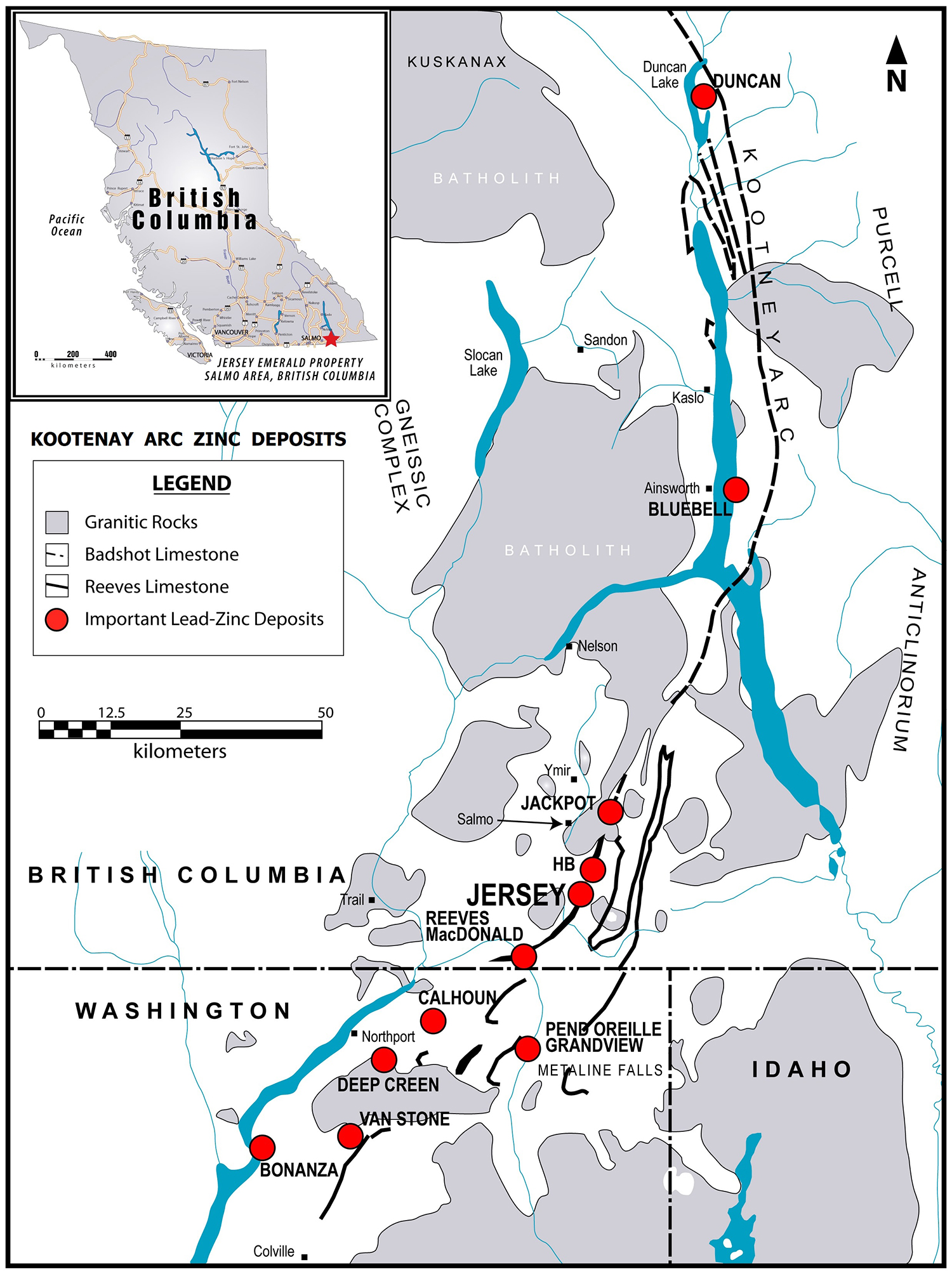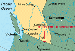 The Jersey Emerald property is located in southeastern British Columbia at latitude 49°06'N and longitude 117°13'W (NTS 82F/3), 10 kilometres southeast of the community of Salmo. The claims cover an area of approximately 17,500 hectares between the Salmo River on the west and the top of Nevada Mountain on the east, and are bounded by Hidden Creek on the north and the South Salmo River on the south. Year round gravel roads and power lines cross the property and water is plentiful. Underground workings of the historic Jersey and Dodger deposits are in excellent condition allowing for future underground access with little rehabilitation.