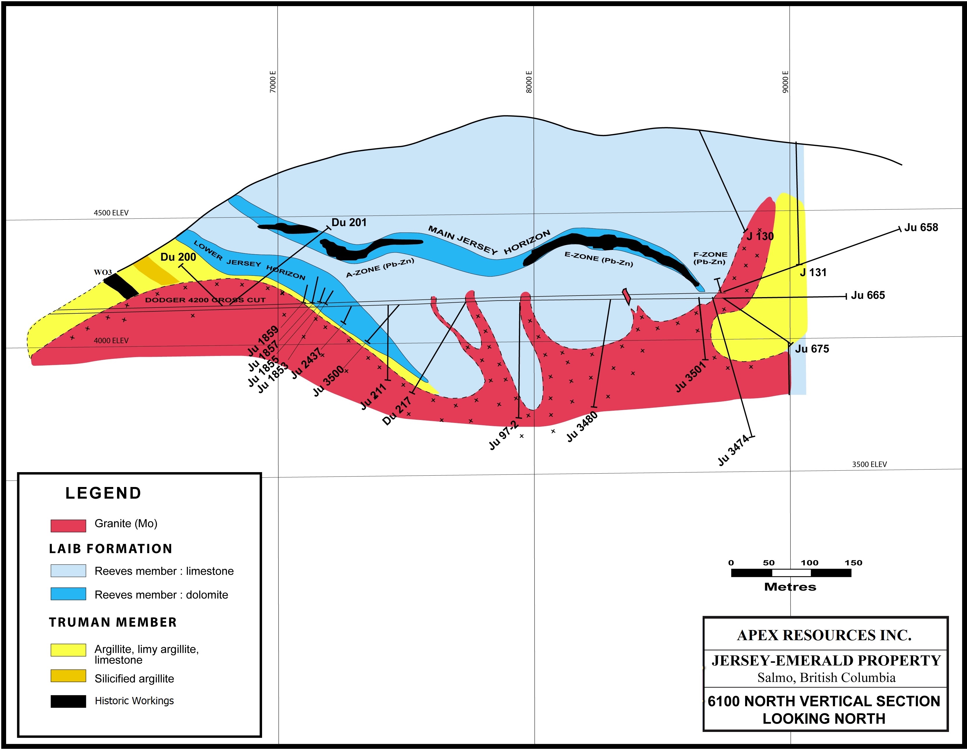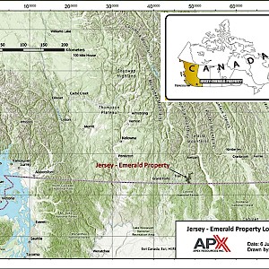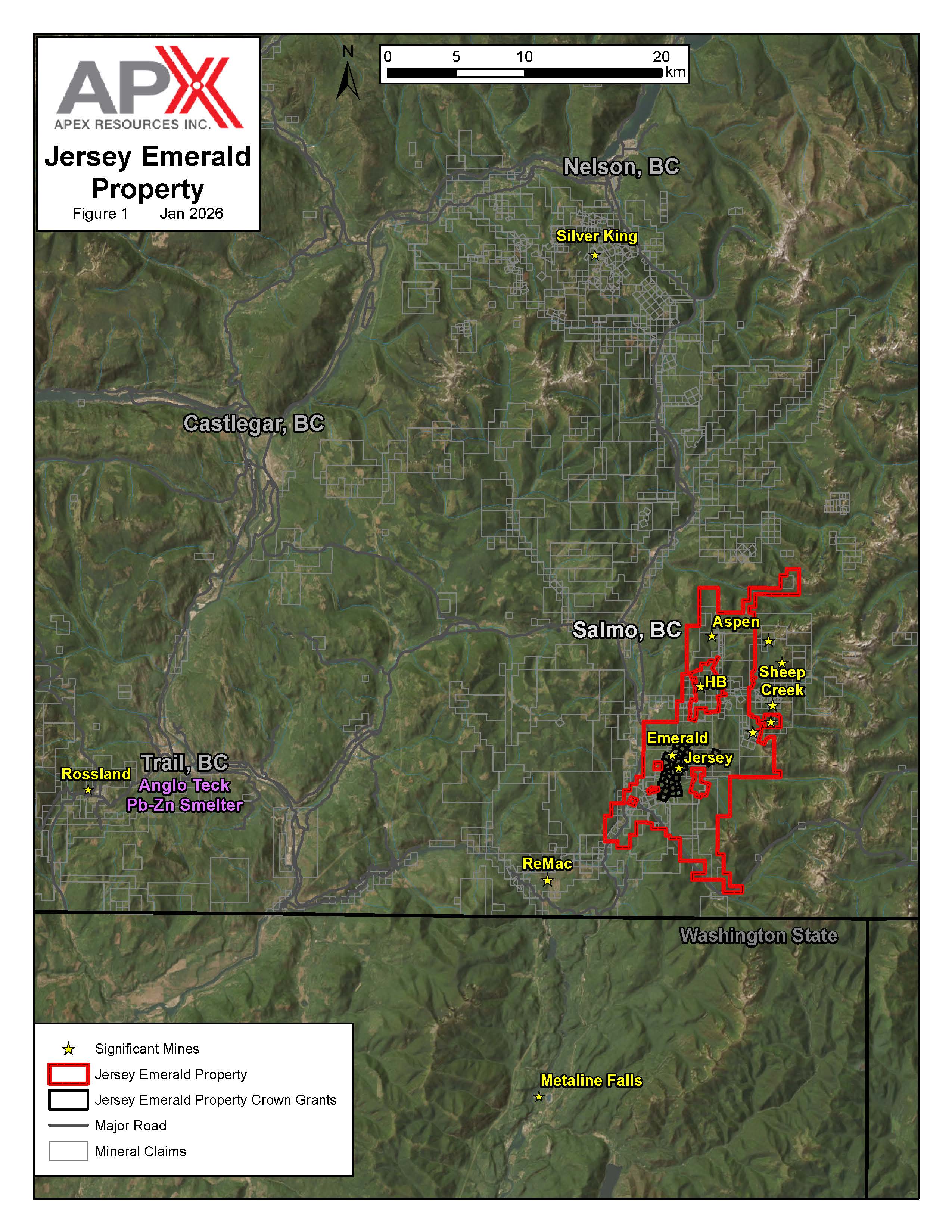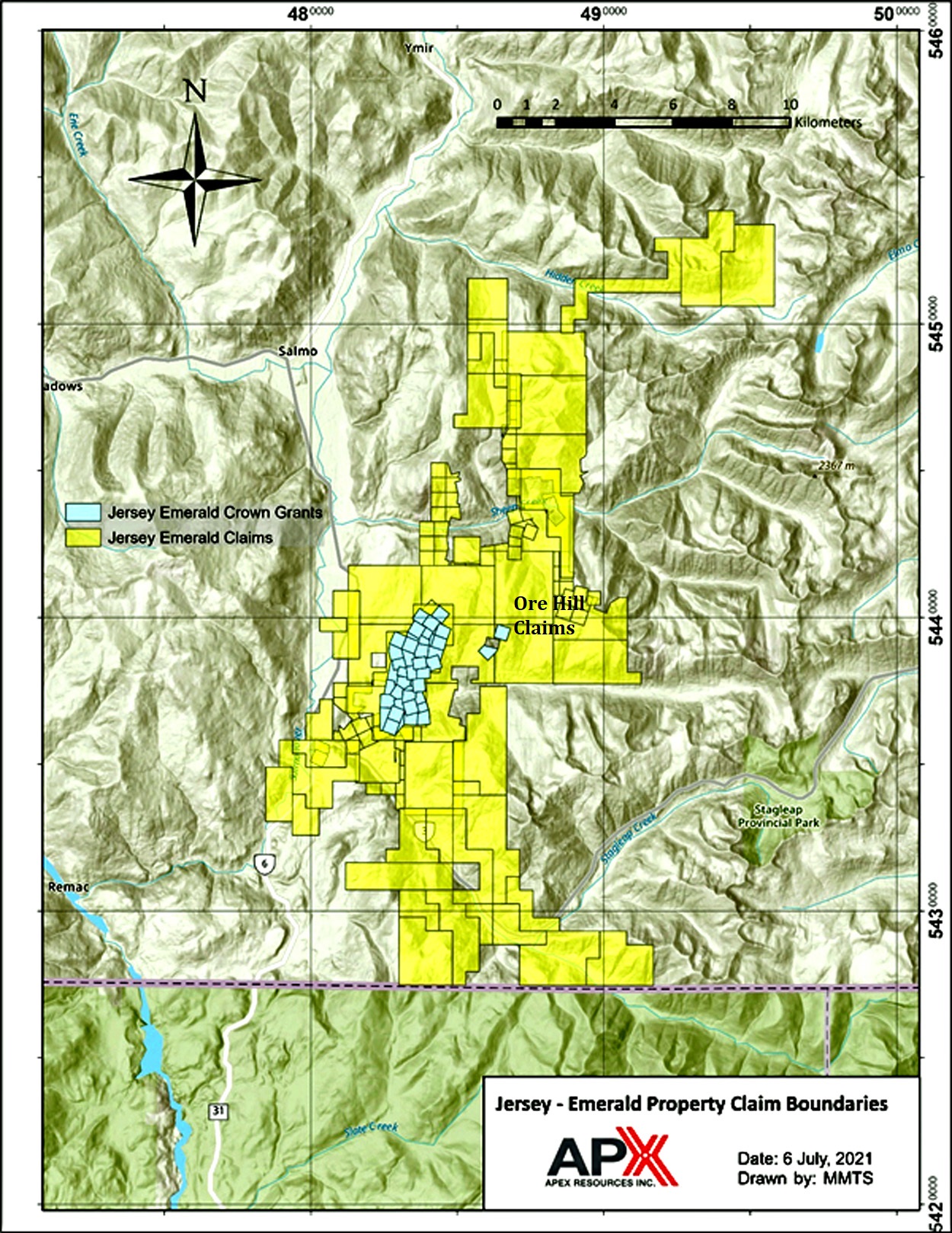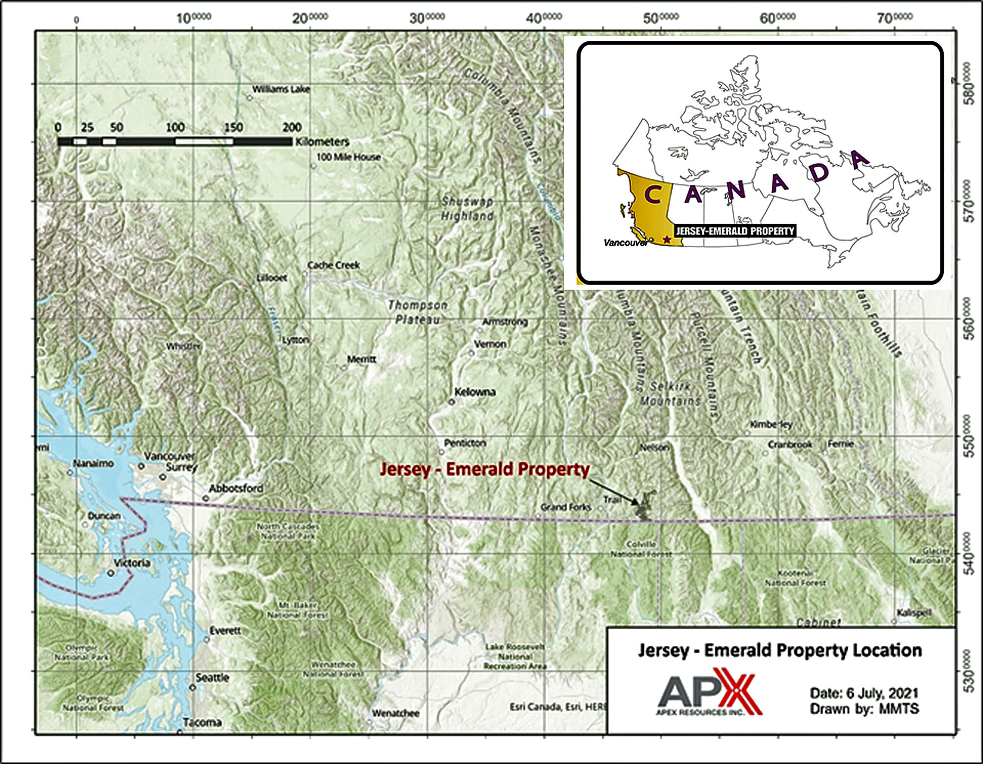 Apex Resource Inc’s wholly owned Jersey-Emerald property is located in southeastern British Columbia, 50 kilometres south of the town of Nelson and 8 kilometres southeast of the community of Salmo. It consists of 120 mineral claims and 44 crown grants over an area of approximately 17,500 hectares. The property encompasses three historic mines; the 2,400 t/d Jersey Lead-Zinc Mine which operated from 1949 to 1970, the 350 t/d Emerald Tungsten Mine which operated intermittently from 1942 to 1973 and the 25 t/d Emerald Lead Mine which operated from 1919 to 1926. The property includes 1,100 acres of freehold land in four adjoining land parcels over the historic mine-workings.