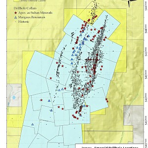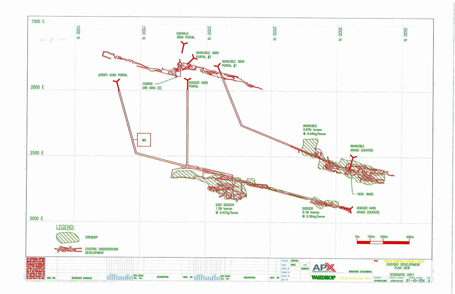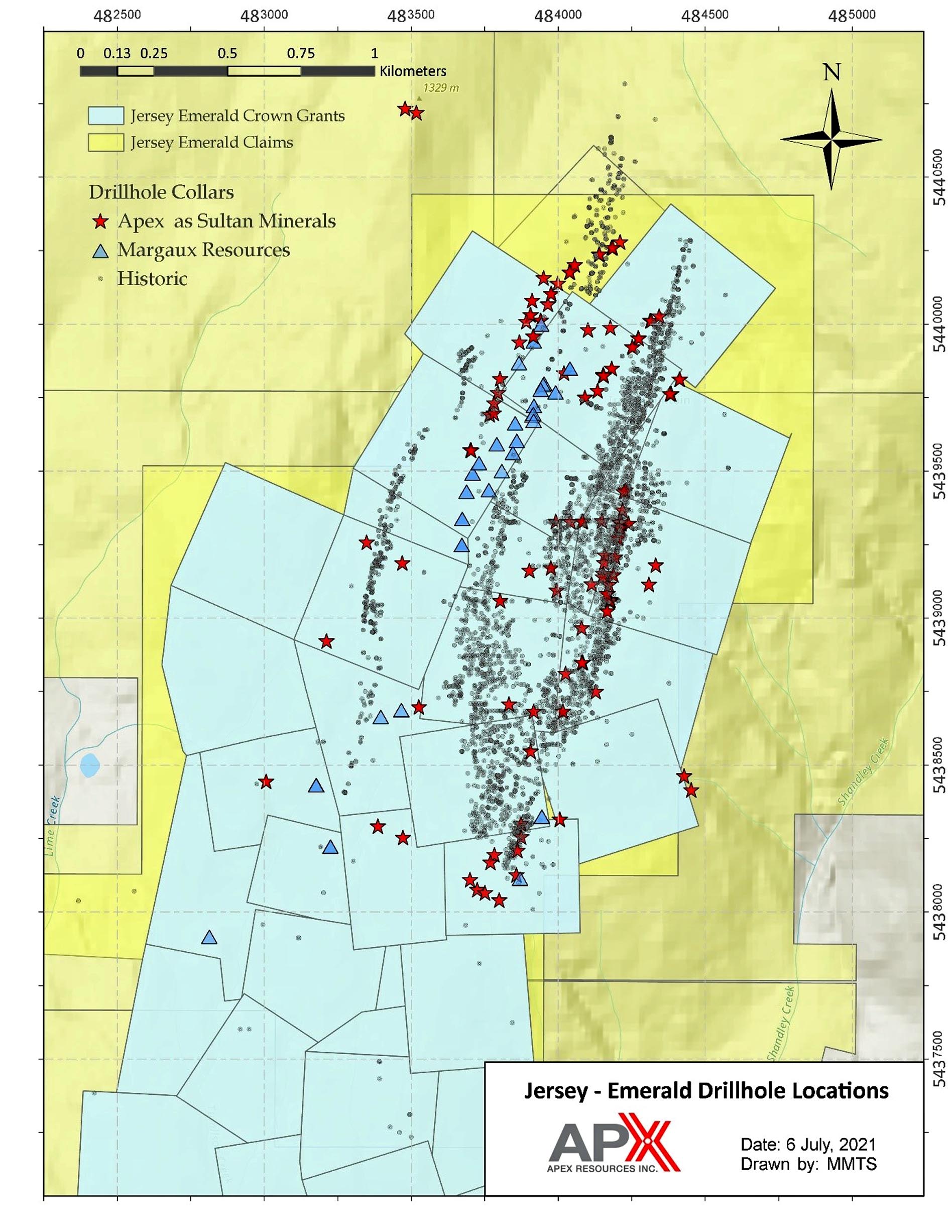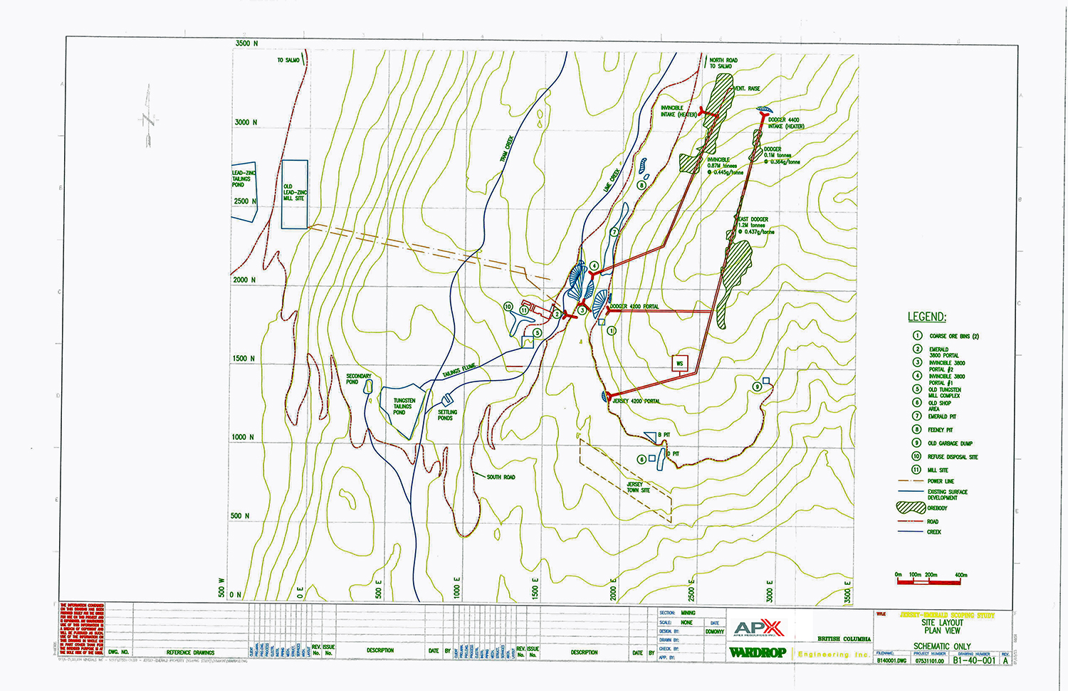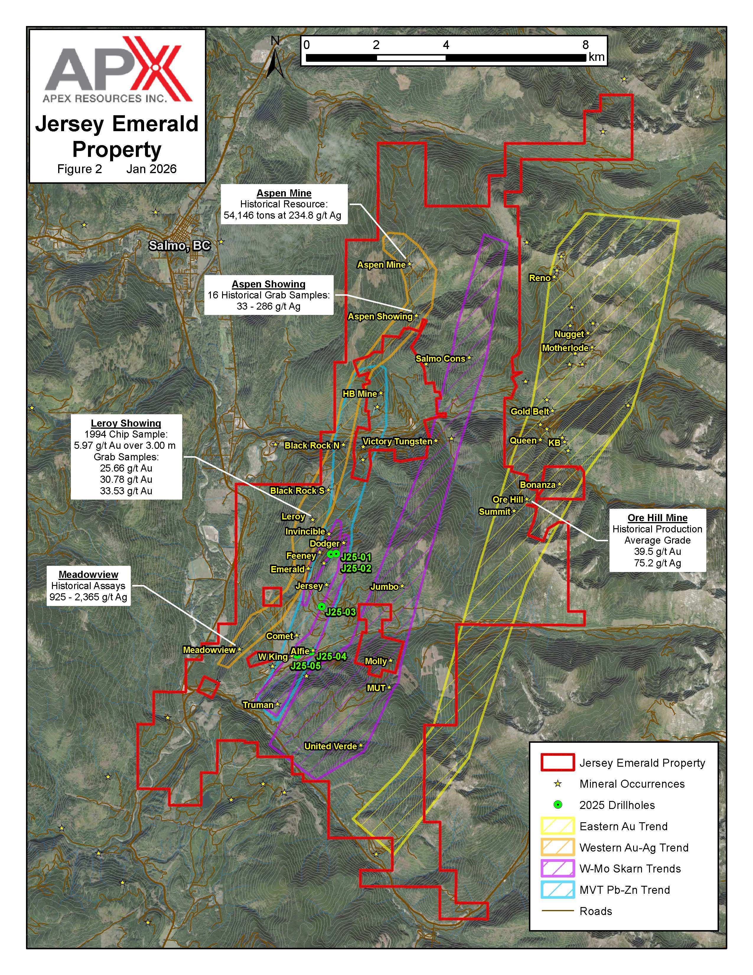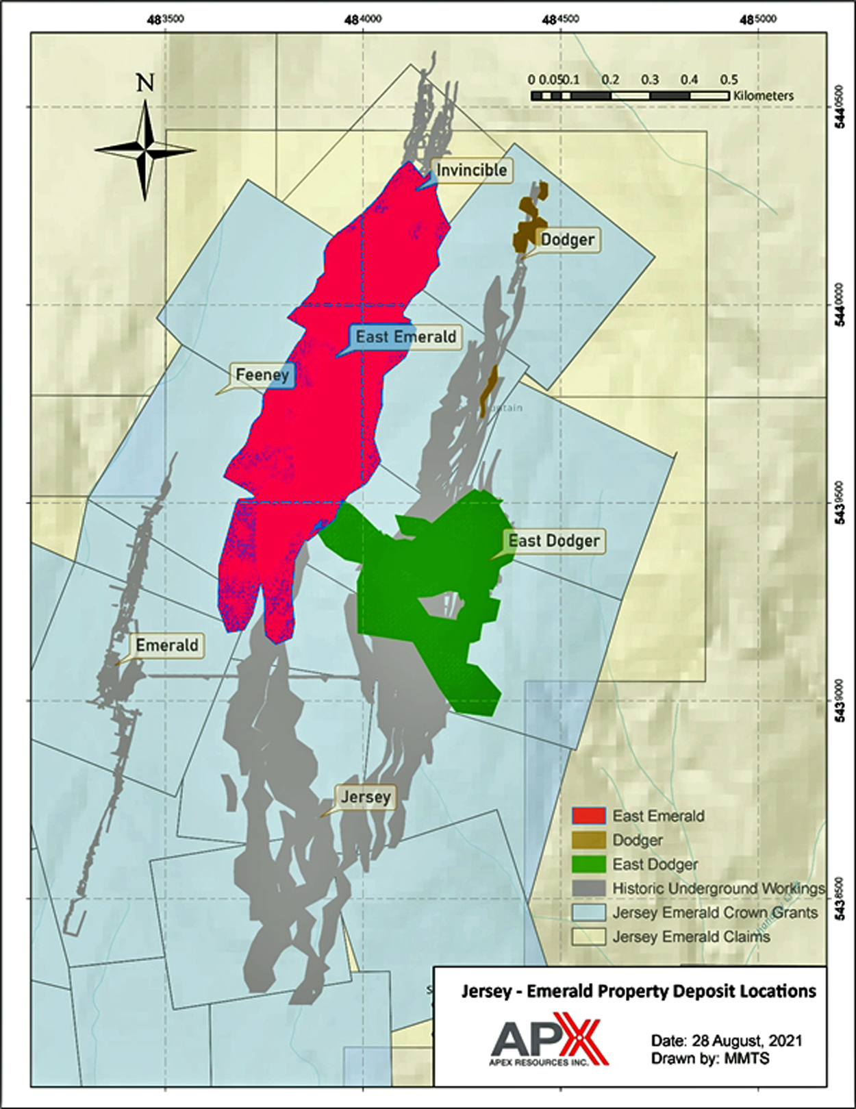 Apex Resource Inc’s wholly owned Jersey-Emerald property is located in southeastern British Columbia, 50 kilometres south of the town of Nelson and 8 kilometres southeast of the community of Salmo. It consists of 120 mineral claims and 44 crown grants over an area of approximately 17,500 hectares. The property encompasses three historic mines; the 2,400 t/d Jersey Lead-Zinc Mine which operated from 1949 to 1970, the 350 t/d Emerald Tungsten Mine which operated intermittently from 1942 to 1973 and the 25 t/d Emerald Lead Mine which operated from 1919 to 1926. The property includes 1,100 acres of freehold land in four adjoining land parcels over the historic mine-workings.