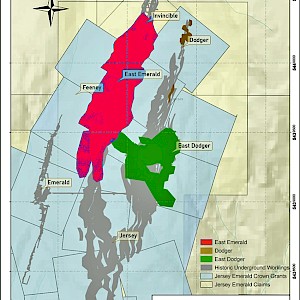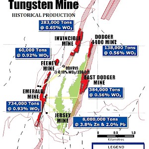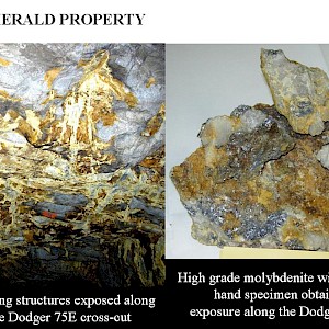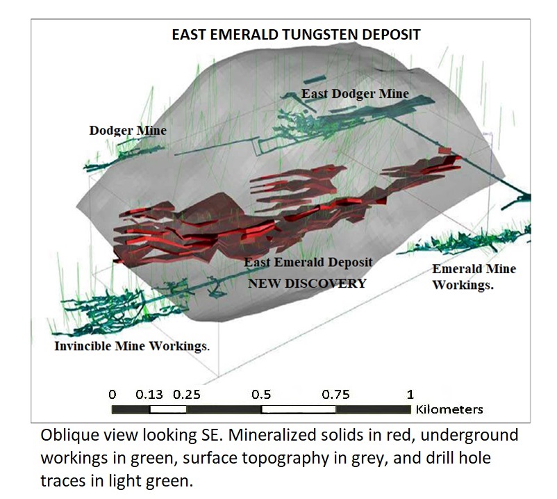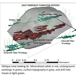 - Tungsten mineralization in five deposits, the Emerald, Feeney, Invincible and Dodger mines and the recently discovered East Emerald deposit occur as massive sulfide lenses (Emerald style mineralization) and stratiform replacement deposits (Dodger style mineralization) in limey sediments marginal to Cretaceous granites.